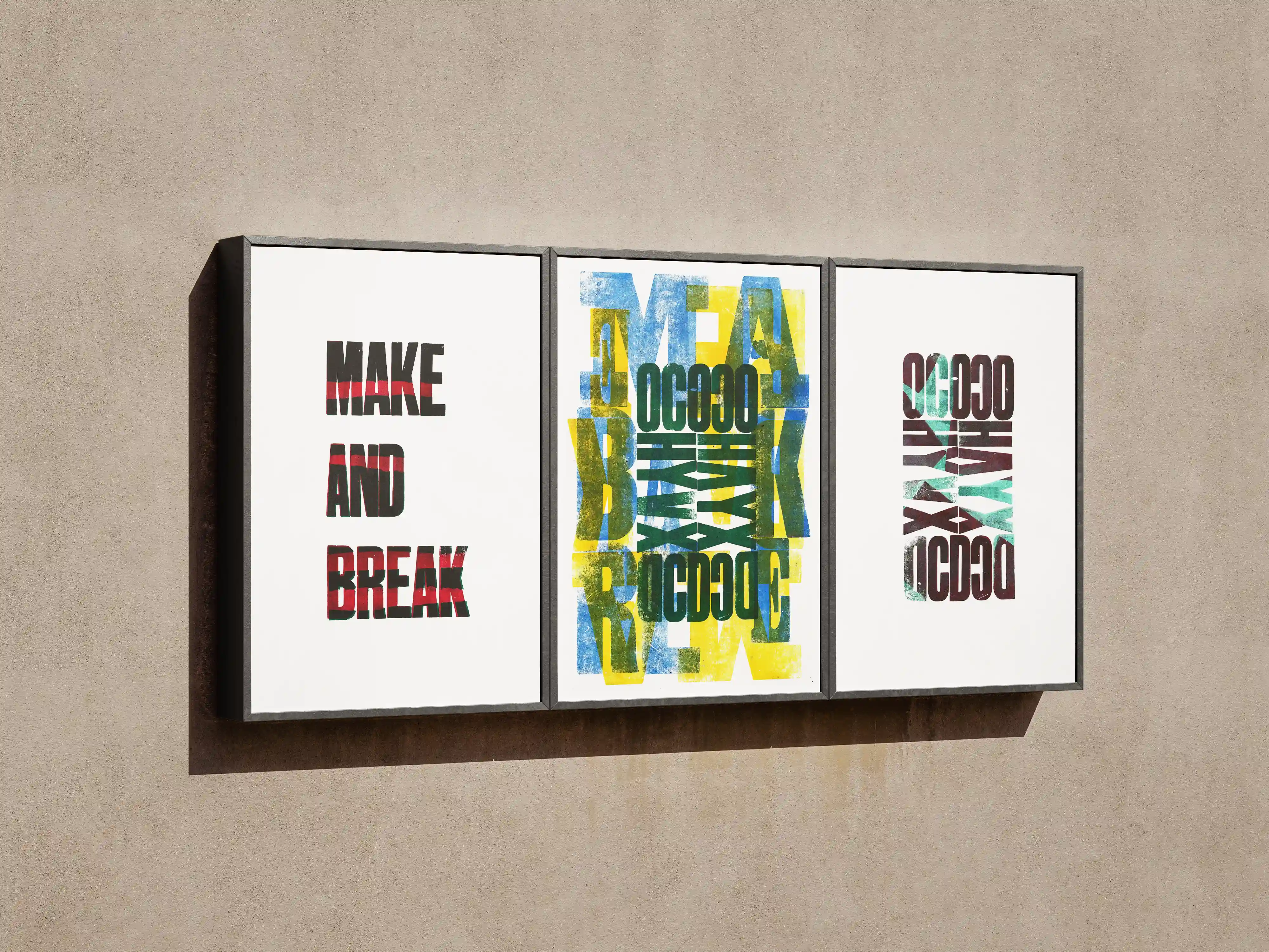 Make and Break is a series of letterpress typographic posters inspired by the cyclical nature of the creative process, where ideas, materials, and beliefs are constantly built up and dismantled. The series explores themes of transformation, ambiguity, and broken communication, visually reflecting the complexity and tension inherent in making something new.