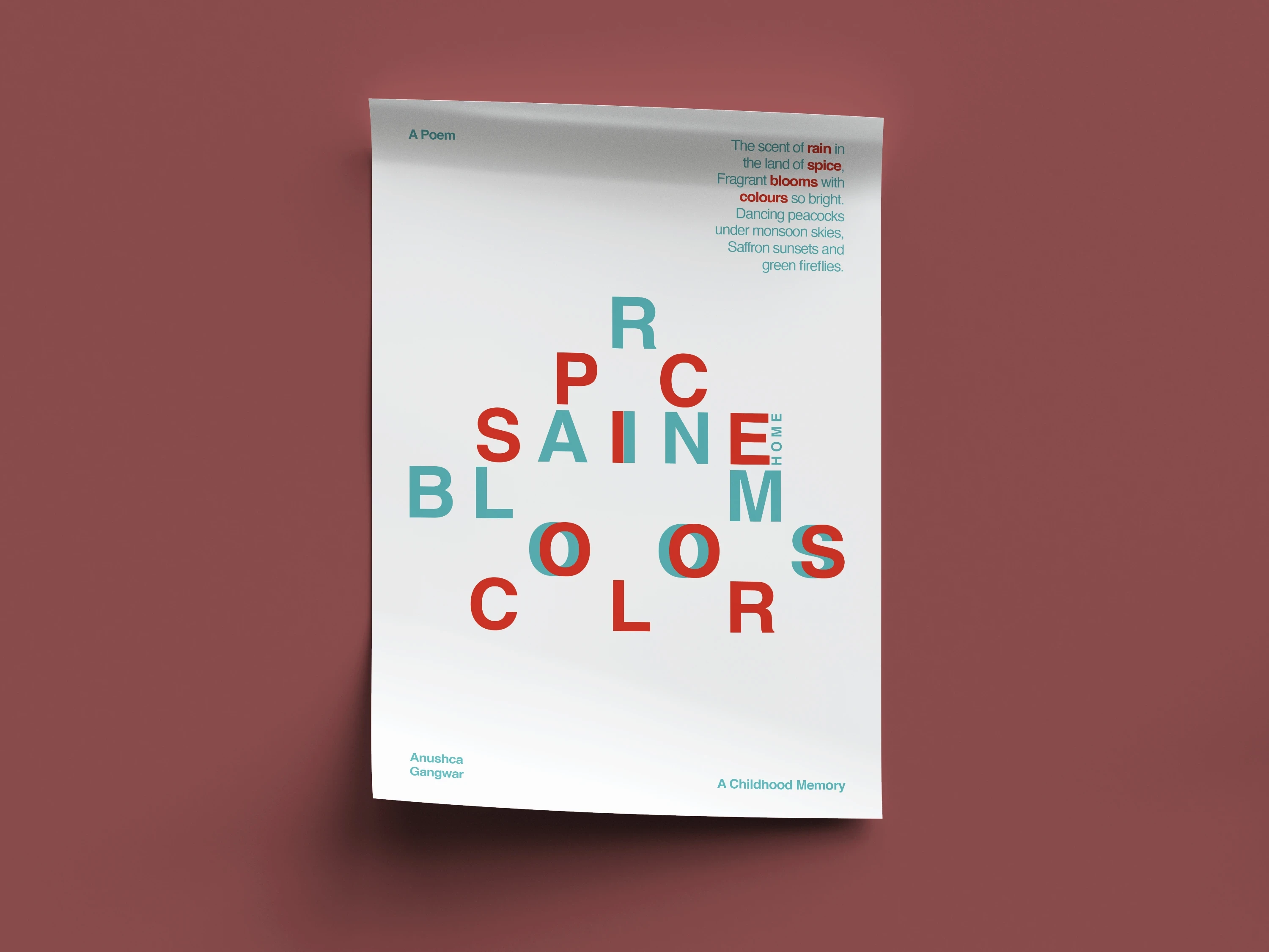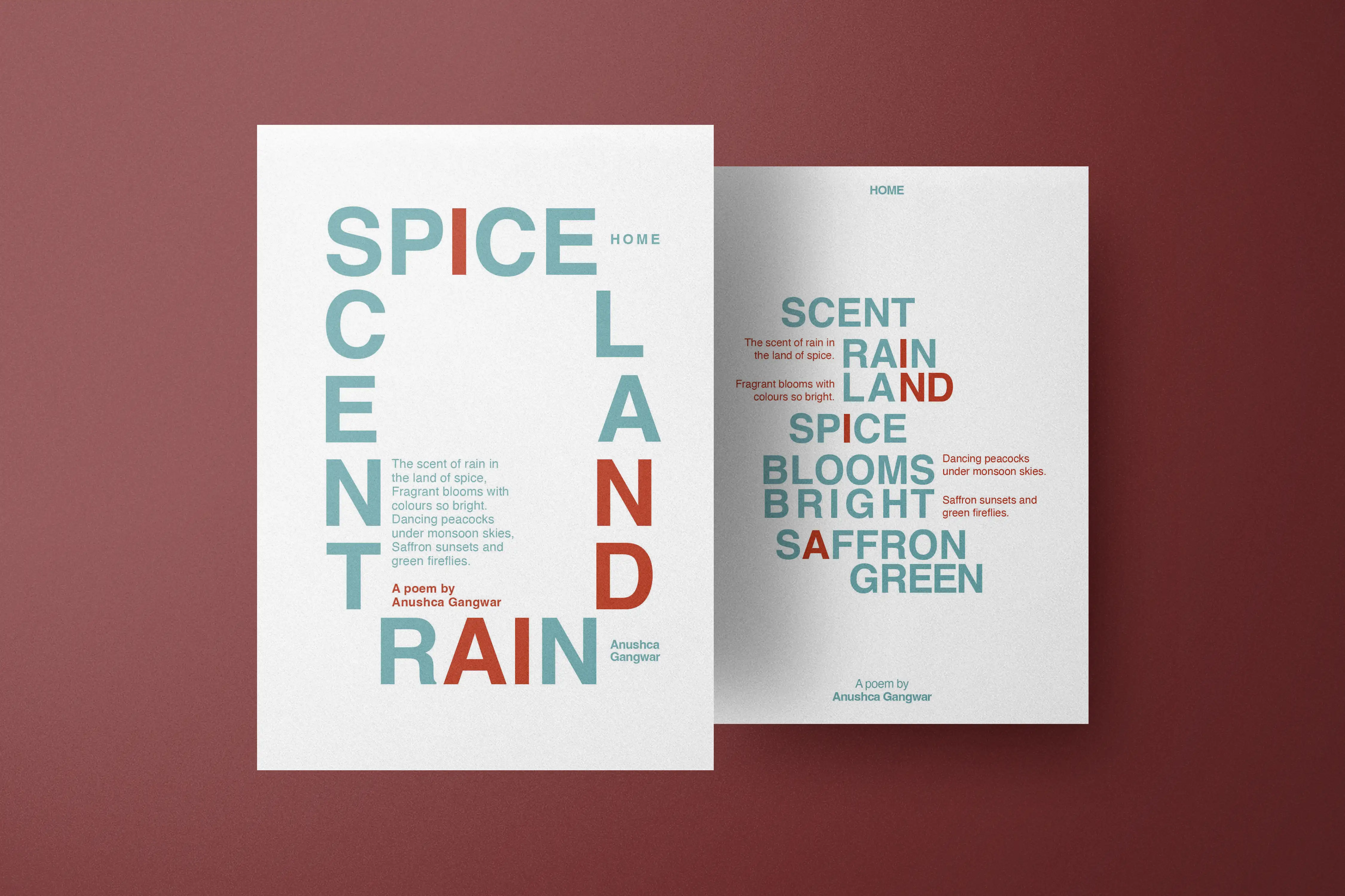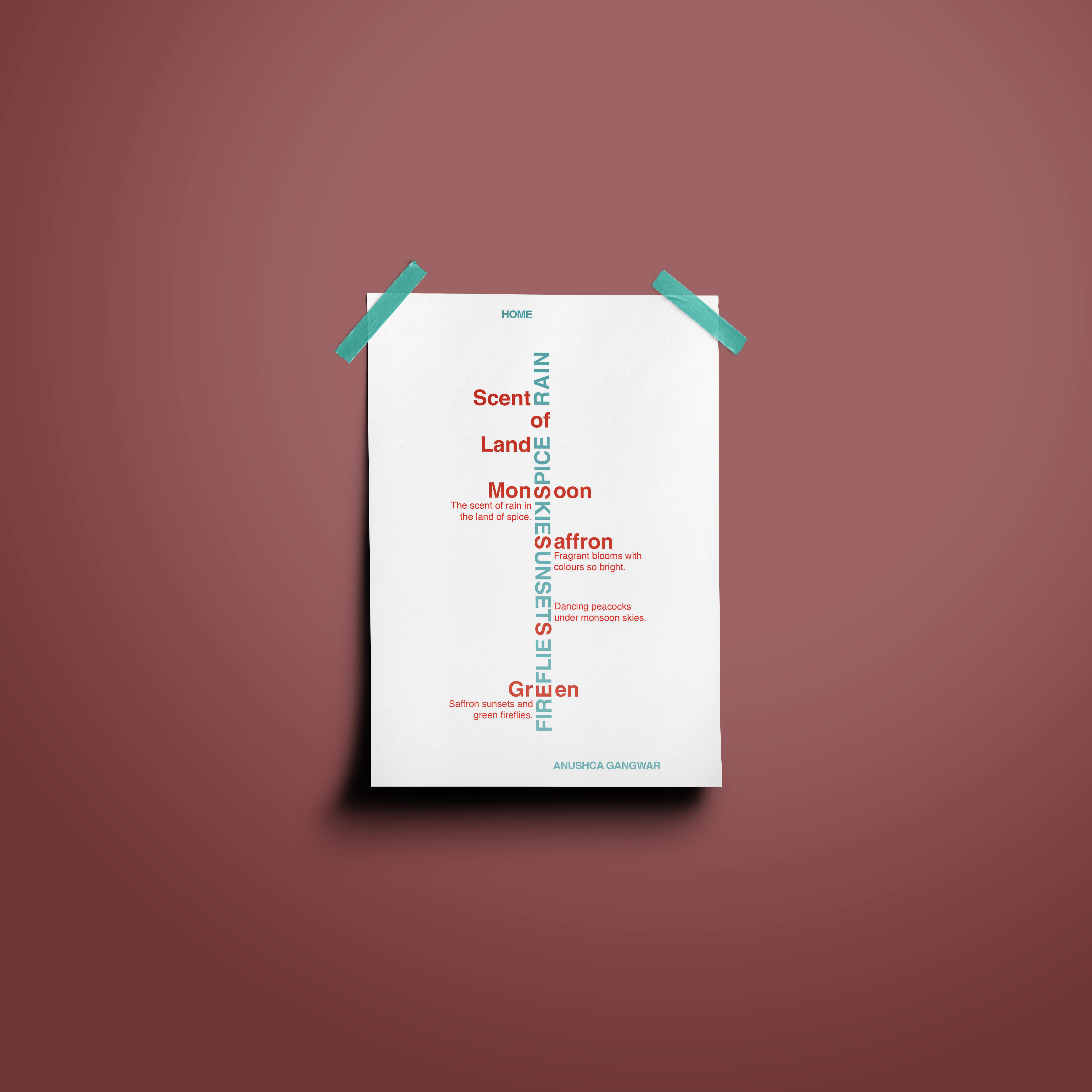 Rain and Spice is a typographic poster series that explores the concept of "Home" through poetic storytelling and visual experimentation. Inspired by childhood memories spent in nature, the project centers around a short, original poem that reflects fleeting moments, sensory details, and the emotional texture of growing up. The goal was to create typographic compositions, using minimal tools, while maintaining a strong conceptual core rooted in nostalgia and personal narrative.