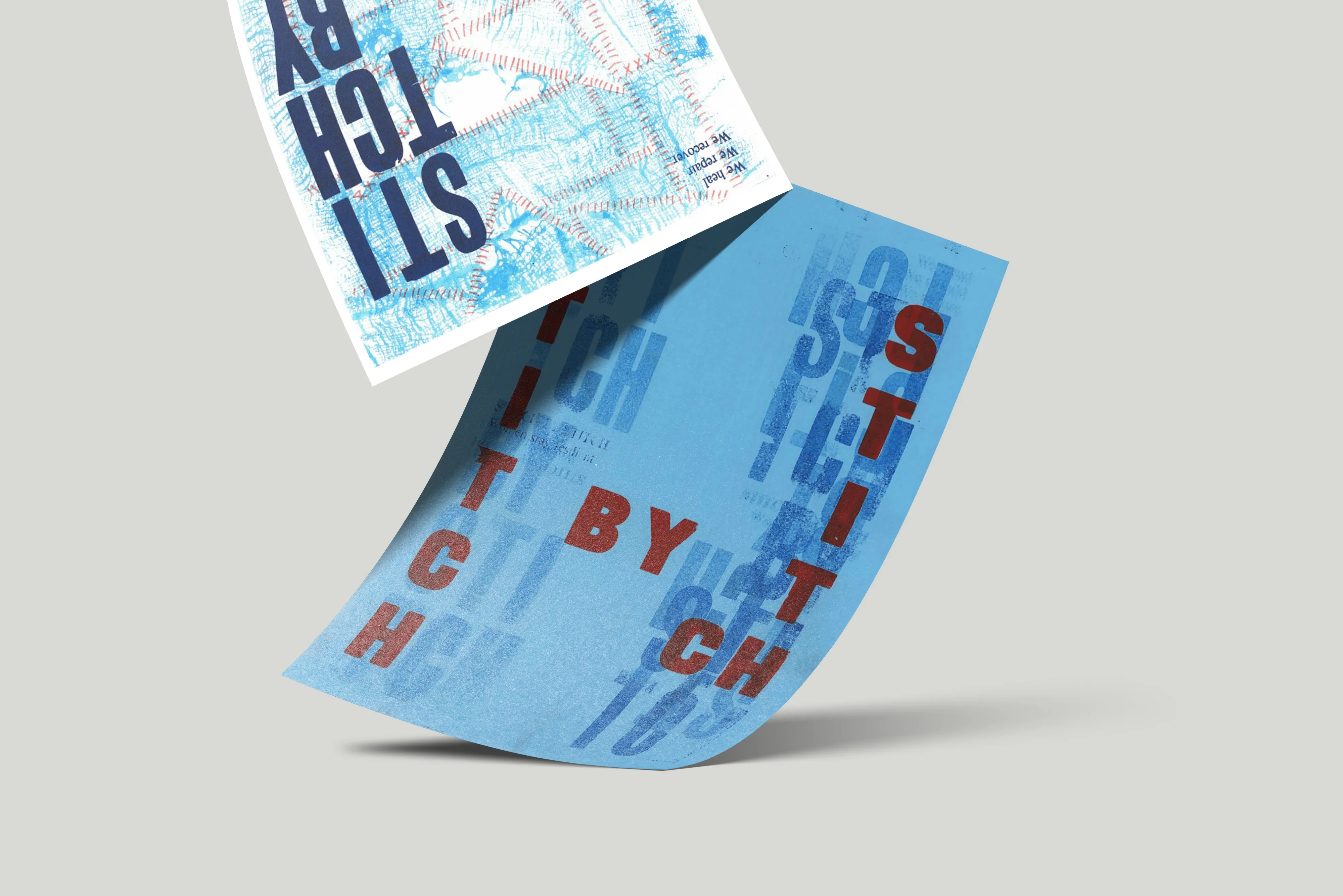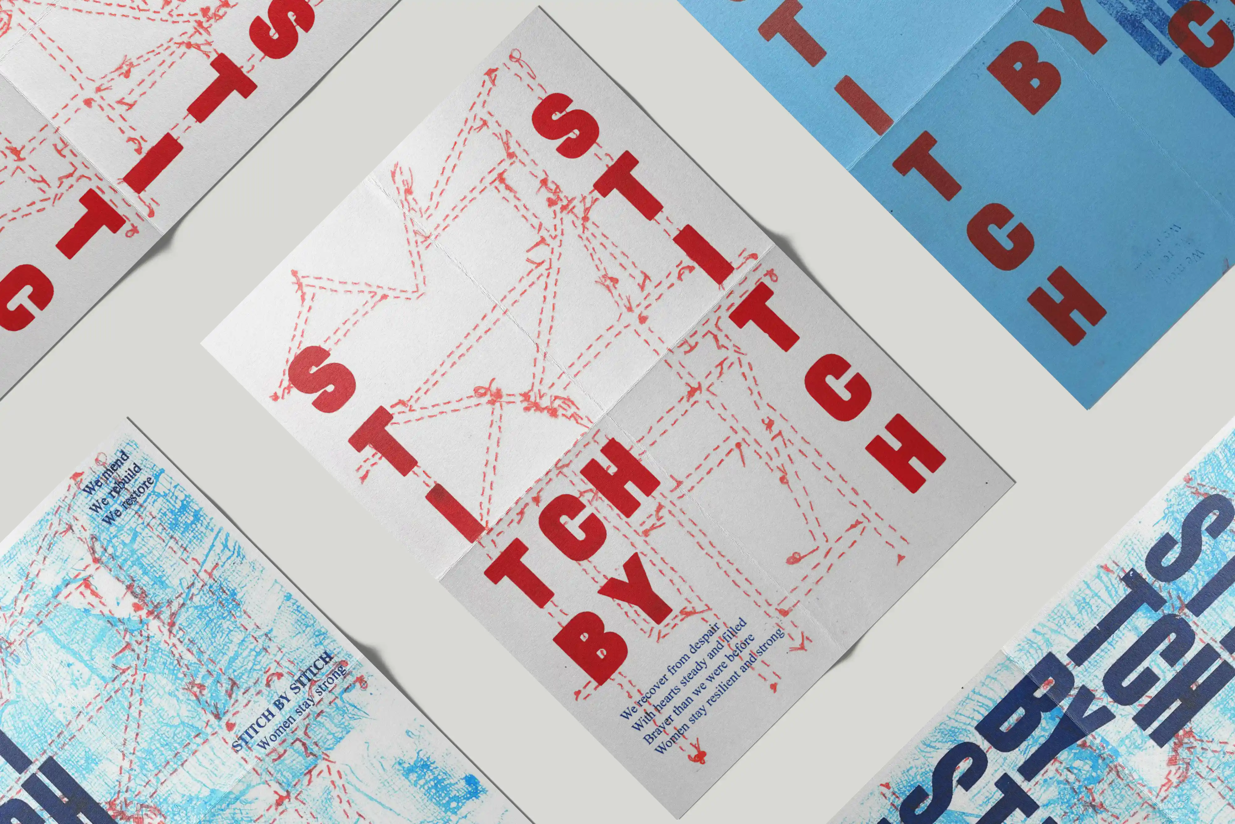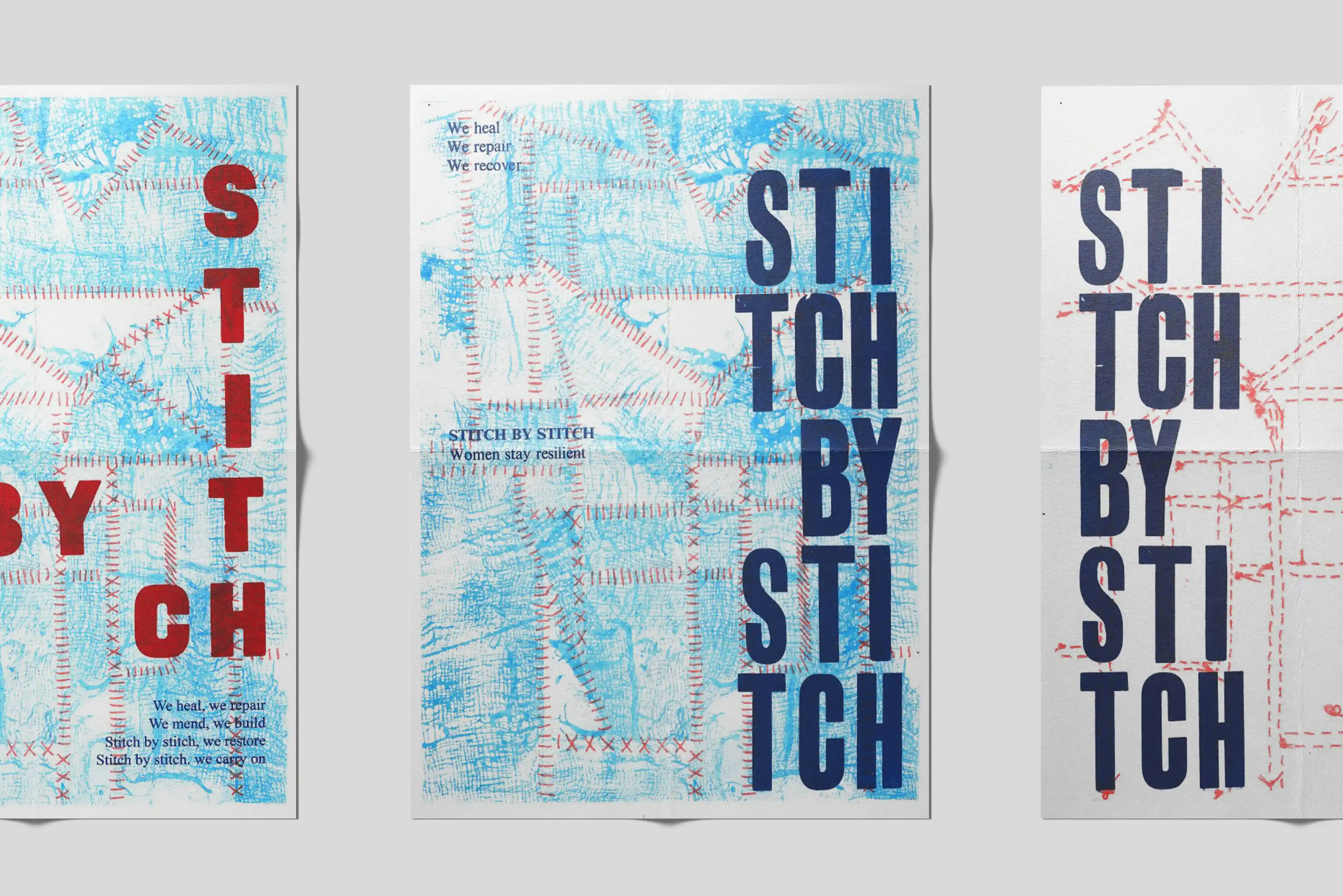 The designs integrate textured appliqué backgrounds with layered typography, visually representing the process of rebuilding and self-renewal. The slogan “Stitch by Stitch” is carefully composed to convey perseverance and hope, placed over tactile surfaces that evoke the craft’s hands-on nature. The interplay between the fragmented fabric patterns and cohesive text creates a visual narrative about overcoming adversity and finding beauty in renewal.